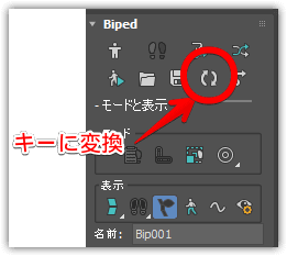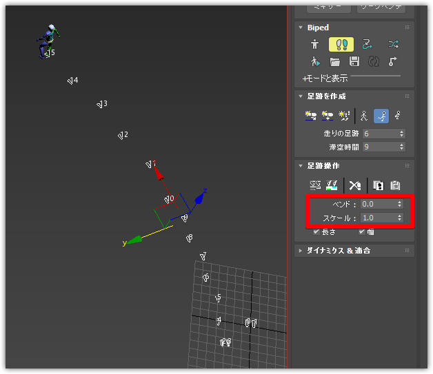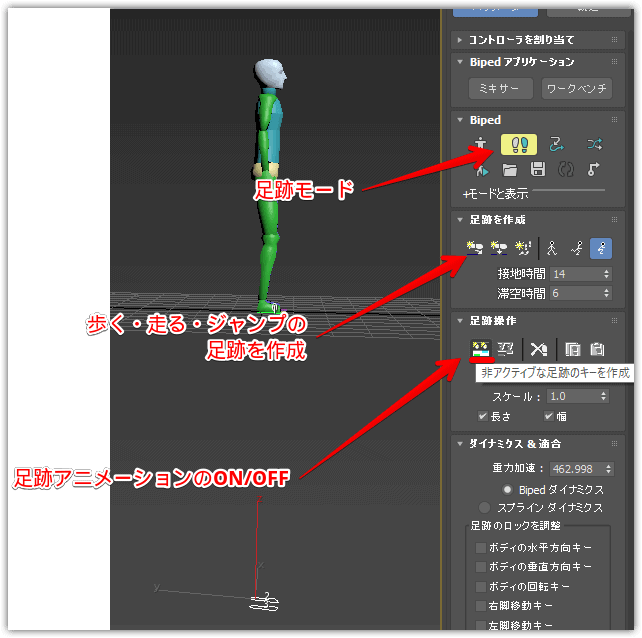 - Bipedを選択して、モーションパネルを開き、足跡アイコンを押して、足跡モードに
