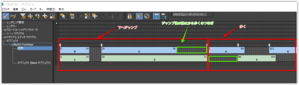 グラフエディタ>トラックビュー>ドープシートから足跡のタイミング調整ができる