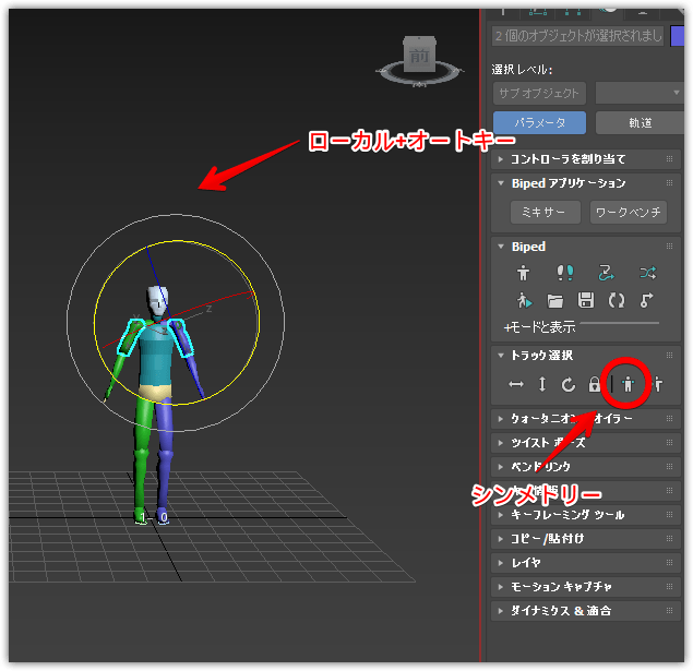 足跡モードを解除して、オートキーにして動かしたい骨を選択(※左右対称に動かしたいときはシンメトリーボタンを押して回転をローカルに)