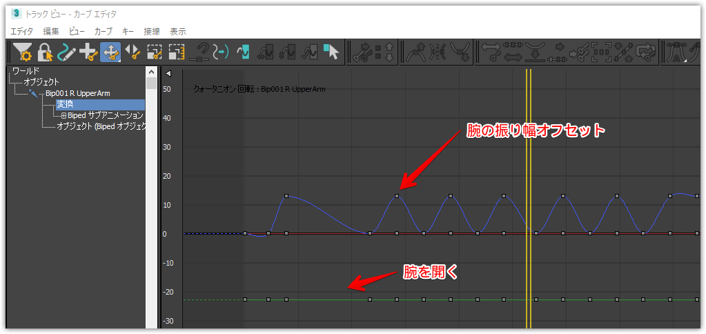 グラフエディタ>トラックビュー>カーブエディタを開き、さきほど動かしたキーのカーブを参考に、他のカーブをオフセットする