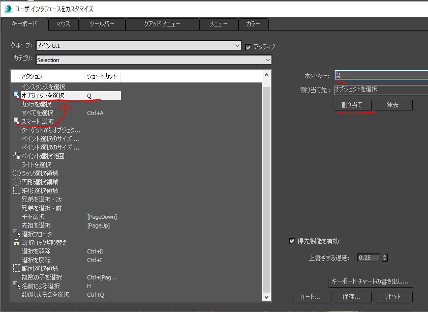 - 『オブジェクト選択』の項目を探して、ショートカット『Q』を割り当てる