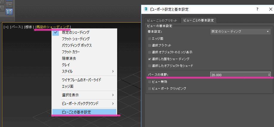 - パースビュー>規定のシェーディング>ビューポート設定と基本設定