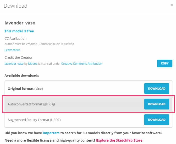 ダウンロードの拡張子の選択画面がでます。今回はglTFを選びました。