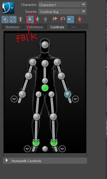 まずHumanIKの人形アイコン>Add to Selectionからコントローラー(IK・FK・ブレンドシェイプ動かすものすべて)を選択して