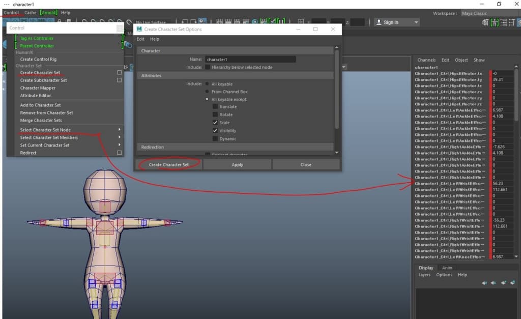 character -name "CharacterSet1" -excludeVisibility -excludeScale;