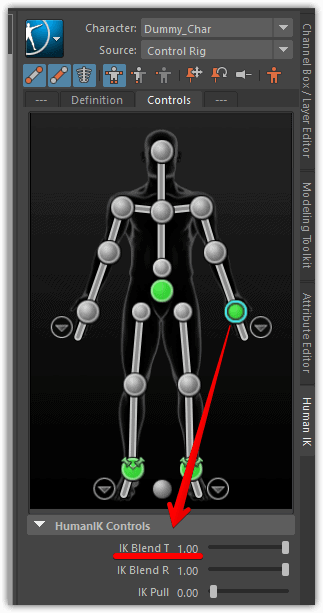 選択して、IK Blend Tという1にしてやると動くようになるので、左右セットします。