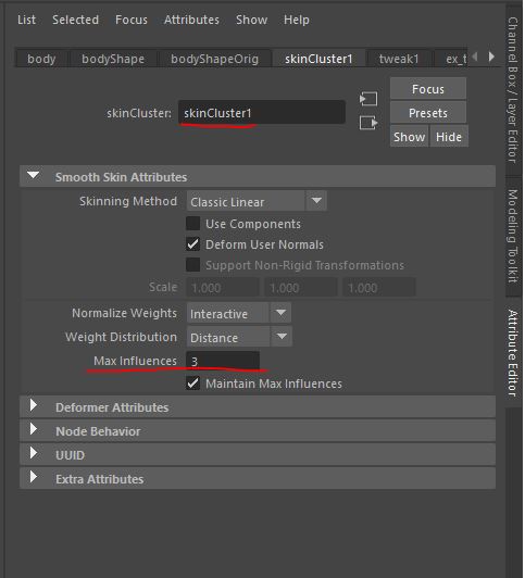- skinClusterを開き、Max Influencesの数字を変更。これで影響する数を変更できる。