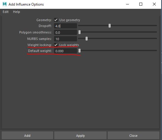 skinClusterInfluence 1 " -dr 4 -lw true -wt 0";