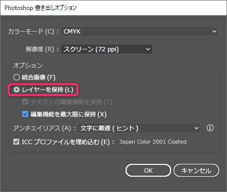 - ・レイヤーを保持にチェック(※カラーモードはCMYKにする必要)
