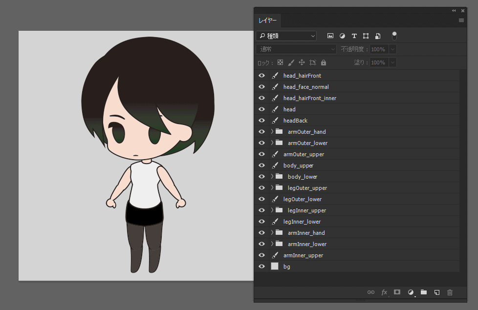動かしそうなところはバラバラにしてます。また目口眉は1つにまとめてます。