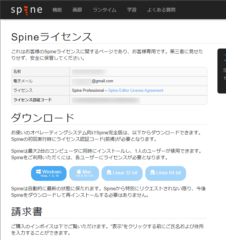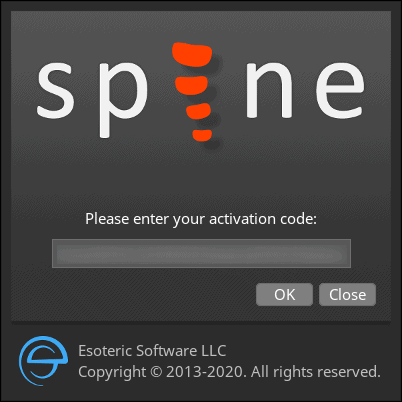 ソフトを起動して「ライセンス認証コード」を入力すればOKボタンがでてきるので、押せば認証が完了してSpineが使用できるようになります。