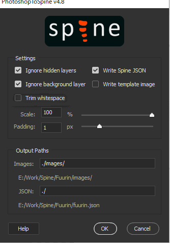 ※「PhotoshopToSpine」のオプションについては下の方にまとめてます➡オプションの詳細へ