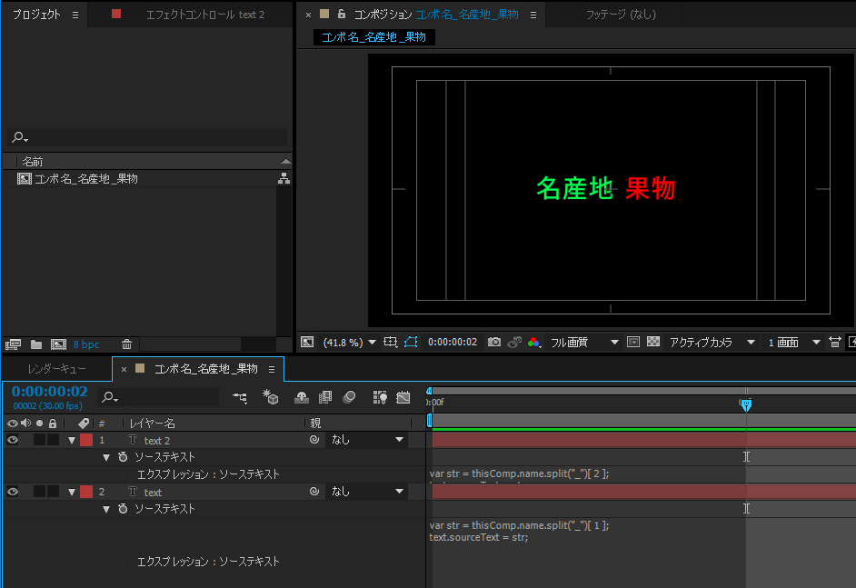 2. 2種類のテキストを作成、ソーステキストに下記のエクスプレッションを挿入