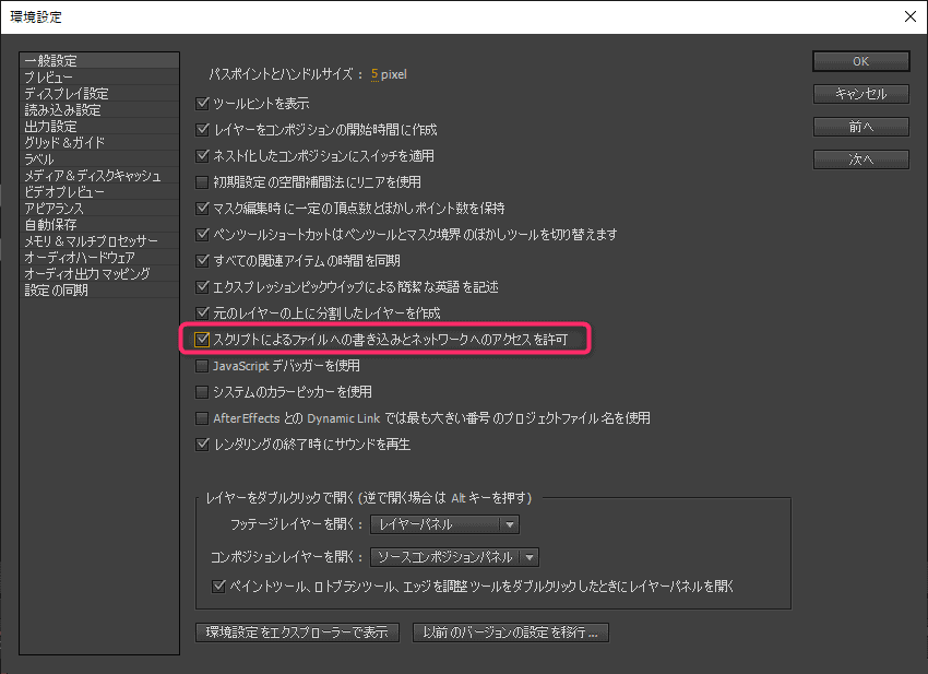 事前にスクリプトが使用できるように設定します。コンポジション>環境設定>一般設定から「スクリプトによるファイルへの書き込みとネットワークへのアクセスを許可」にチェックを入れます。