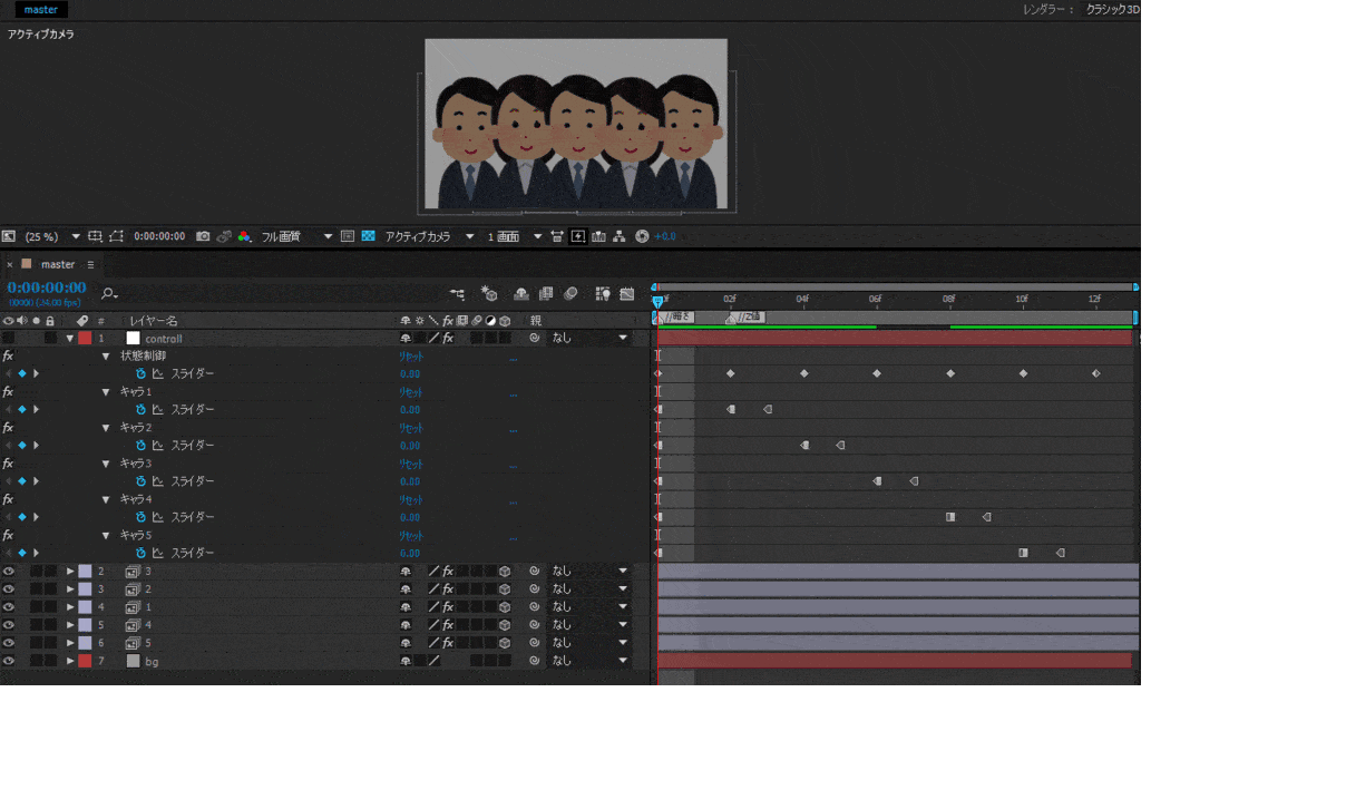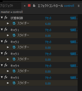 if (comp("master").layer("controll").effect("状態制御")("スライダー")== 6) 0※画像名を条件にして、状態を変化させています。値6の時は全員、明るく表示されます。