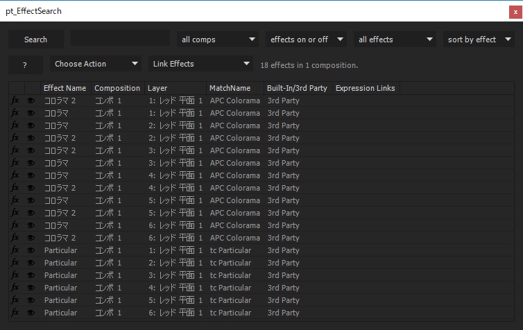 Searchボタンで一発で使用されているエフェクトがリスト化されます。