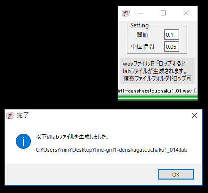 Wav2Lab.exeを起動して、音声データをドラッグ&ドロップします。line-girl1-denshagatouchaku1.labというデータが生成されます。