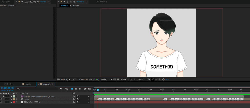 コンポジションを選択して、ファイル>スクリプト>スクリプトファイルの実行でline-girl1-denshagatouchaku1.labを選択します。