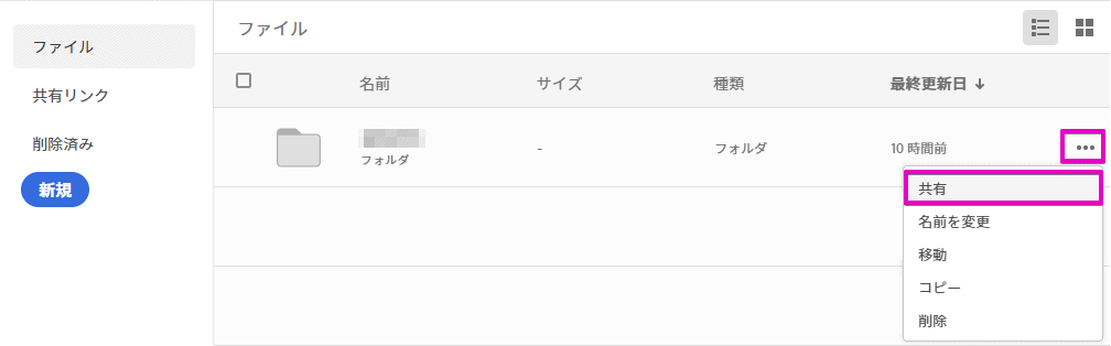 フォルダの右側のスリードットをクリックして、共有を選択します。