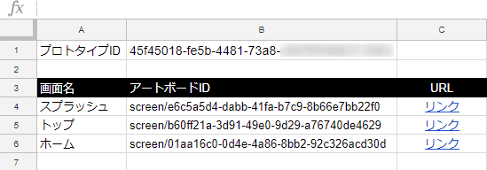 XDのプロトタイプURLを控えて、「プロトタイプID」「画面名」「アートボードID」「URL」を記述します。