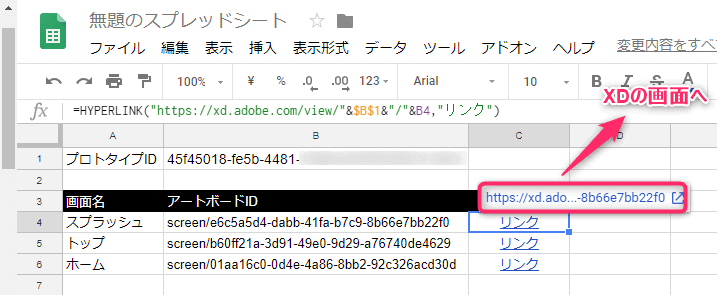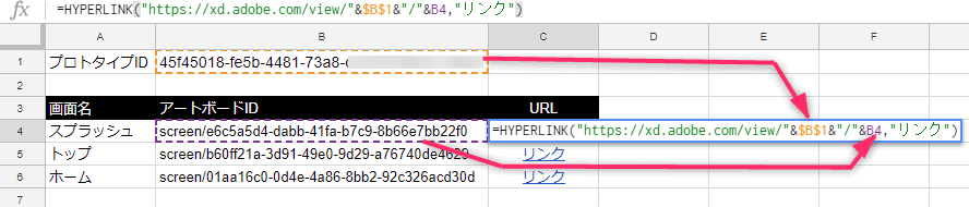 =HYPERLINK("https://xd.adobe.com/view/"&$B$1&"/"&B4,"リンク")