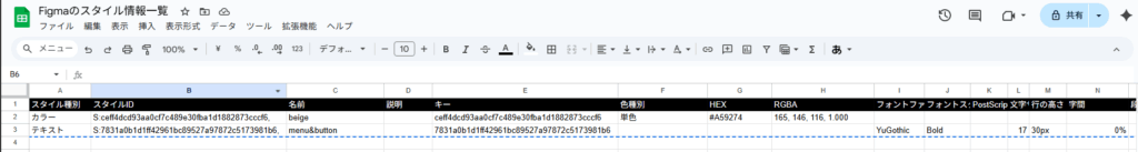 | スタイル種別 | スタイルID | 名前 | 説明 | キー | 色種別 | HEX | RGBA | フォントファミリー | フォントスタイル | PostScript名 | 文字サイズ | 行の高さ | 字間 | 段落間隔 | 段落インデント | テキスト変換 | 装飾 | エフェクト | レイアウトグリッド |