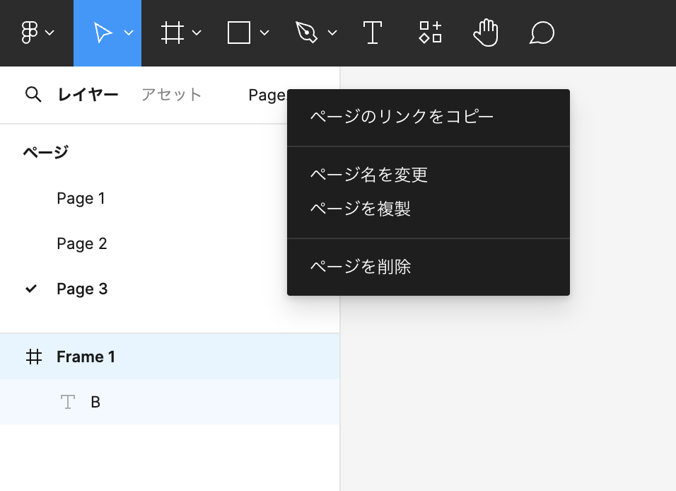 メニューの直下、Page1の∨マークをクリックするとPage(ページ)の表示が展開されます。