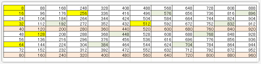 表に2のべき乗、64の倍数、整数に色をつけています。