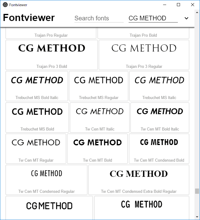 - 右上の入力欄から文字を入力すると全フォントでその文字を表示してくれます。