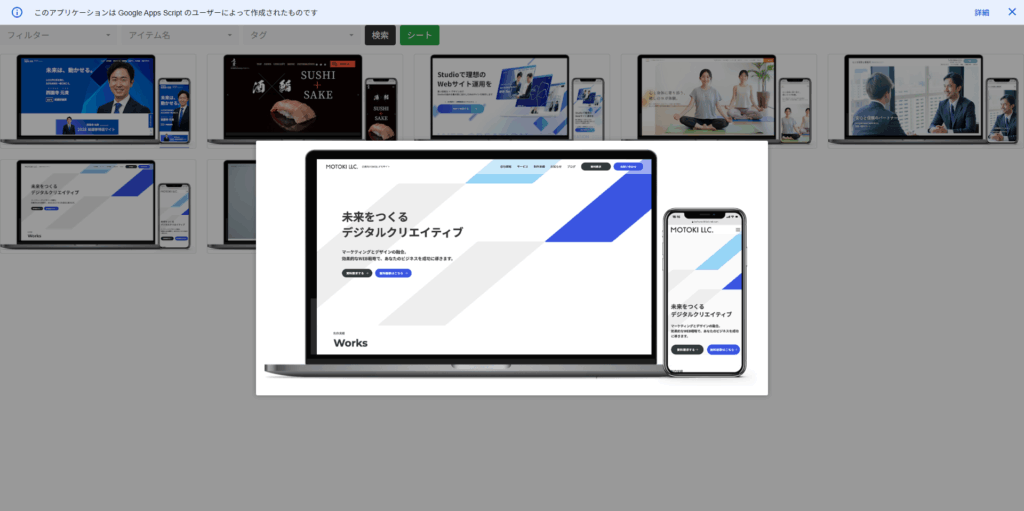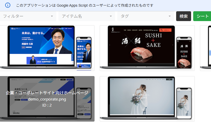 GASでコードを書いて、スプレッドシートの情報を元にWebアプリでギャラリー表示をします。