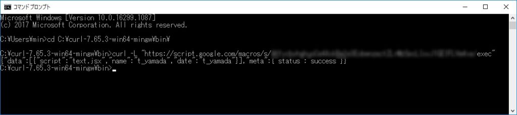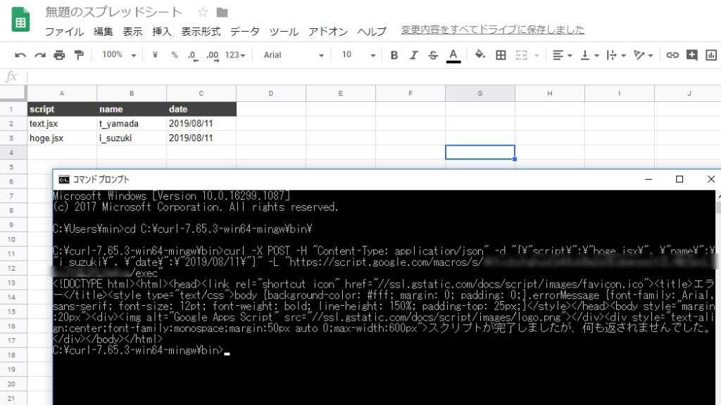 curl -X POST -H "Content-Type: application/json" -d "{\"script\":\"hoge.jsx\", \"name\":\"i_suzuki\", \"date\":\"2019/08/11\"}" -L "https://script.google.com/macros/s/xxxxxxxxxxxxxxxxxxx/exec"MacやLinuxの場合は、シングルクォーテーションでもOK: