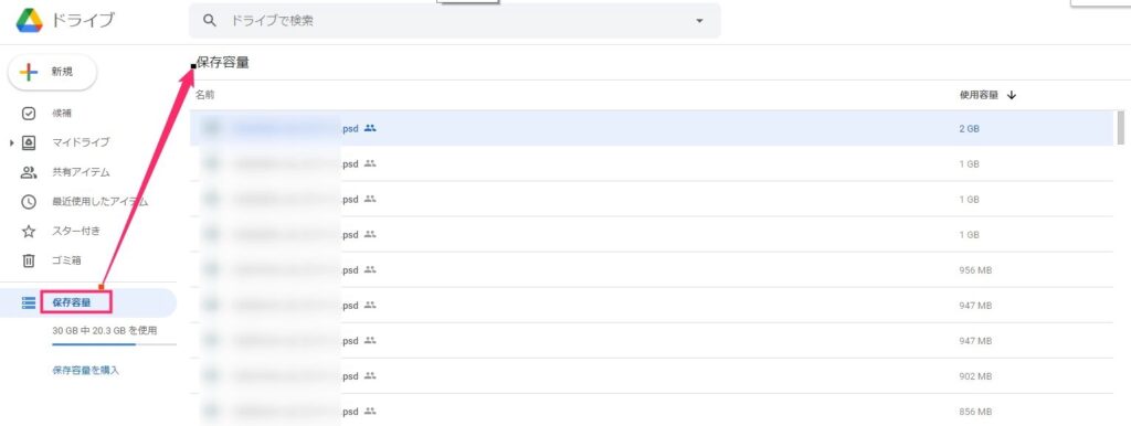 Googleドライブを開いて、左メニューから保存容量を選択します。