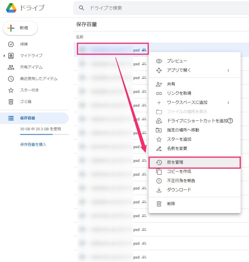 調べたいデータを選択して、右クリックから版を管理を選択します。