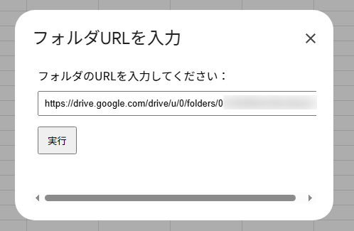 カスタムメニューを選択→モーダルにGoogleドライブのフォルダのURLを挿入→新しいシートにファイル情報が記載される。