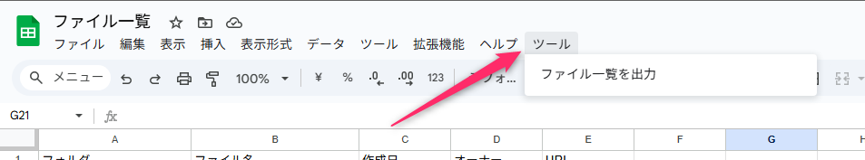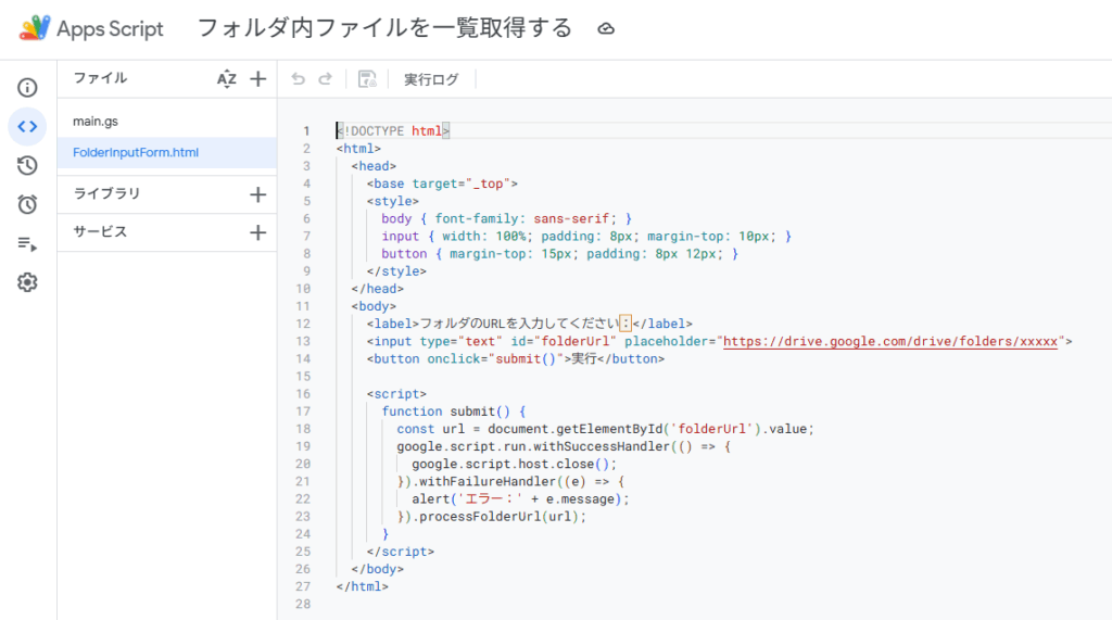 FolderInputForm.htmlを追加し、HTMLコードを貼り付ける - 一度スプレッドシートを再読み込みし、「ツール」メニューから使用できます