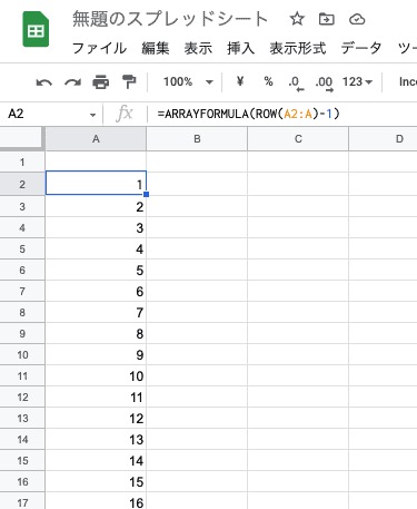 =ARRAYFORMULA(ROW(A2:A) - 2)- 任意の開始番号