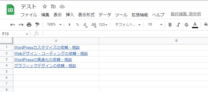 入力後、B列に各セルのリンク先URLが表示されるようになります。