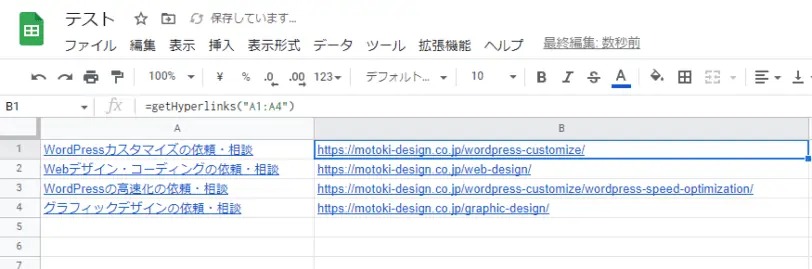 =getHyperlinks("A1:A4")「A1:A4」の部分は、実際にリンク付きテキストが入っているセル範囲に合わせて調整しましょう。