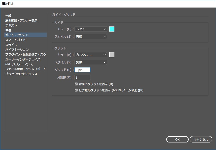- グリッドを8px、分割を1に設定(好みに応じて調整)