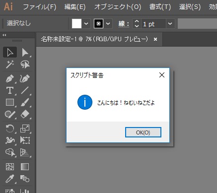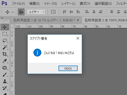 Photoshopを開いた状態で Ctrl+Shift+A を押すと、alert.jsx が実行される!