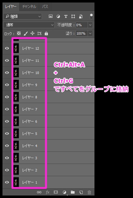 - レイヤーパネルで全選択(