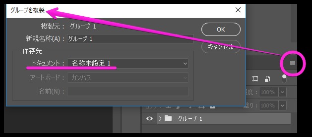 - レイヤーパネル > グループを複製 で1つのファイルにまとめる