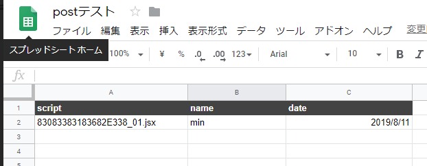 ExtendScriptから直接Googleスプレッドシートに値を送信するには制限があり、ソケット通信も上手く機能しませんでした。