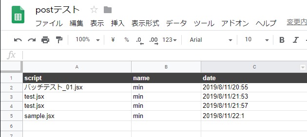 “https://script.google.com/macros/s/発行されたID/exec?p1=スクリプト名.jsx&p2=使用者名&p3=使用日時”ESTKからバッチを使ってスプレッドシートに値を送信する方法
