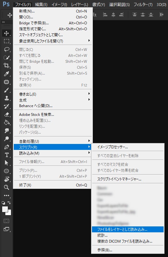 - [ファイル] → [スクリプト] → [ファイルをレイヤーとして読み込み] を選択します。