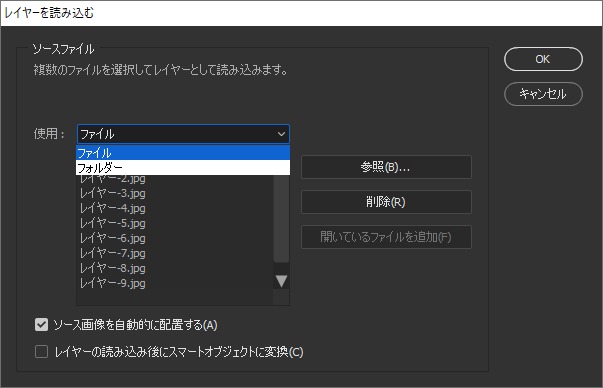 - 「レイヤーを読み込み後にスマートオブジェクトに変換」 にチェックを入れると、自動でスマートオブジェクト化されます。