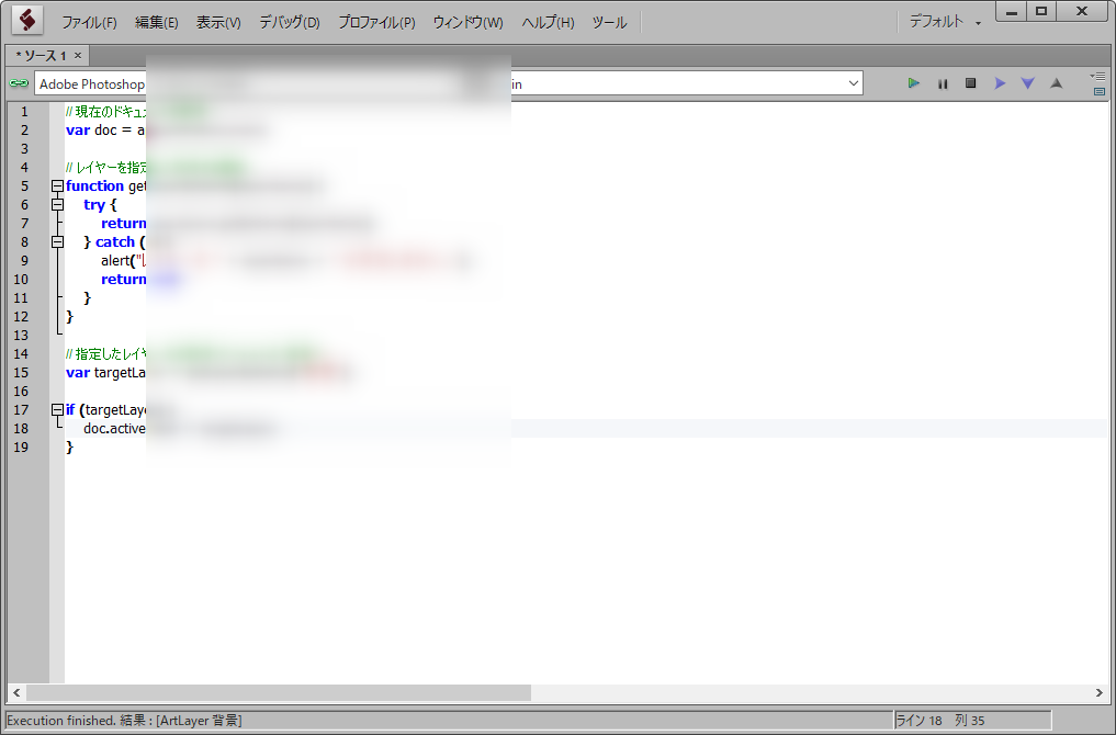 app.activeDocumentが存在するかをチェックdoc.layers.getByName("背景")が存在するかをチェック- 任意のレイヤー名を受け取れるようにパラメータ化