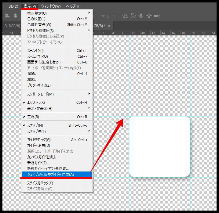 まず、対象の図形レイヤーを選択した状態で、 表示>シェイプから新規ガイドを作成 を選択します。