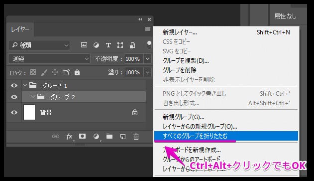 - 「レイヤー」>「オプション」>「すべてのグループを折りたたむ」 を選択