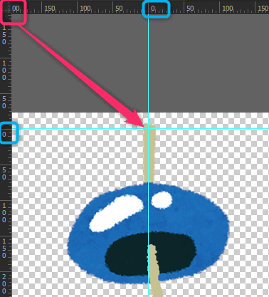 Photoshopのルーラーの(0,0 )地点が原点になるので、ルーラーをドラックして、風鈴の根本を(0,0)にしましょう。